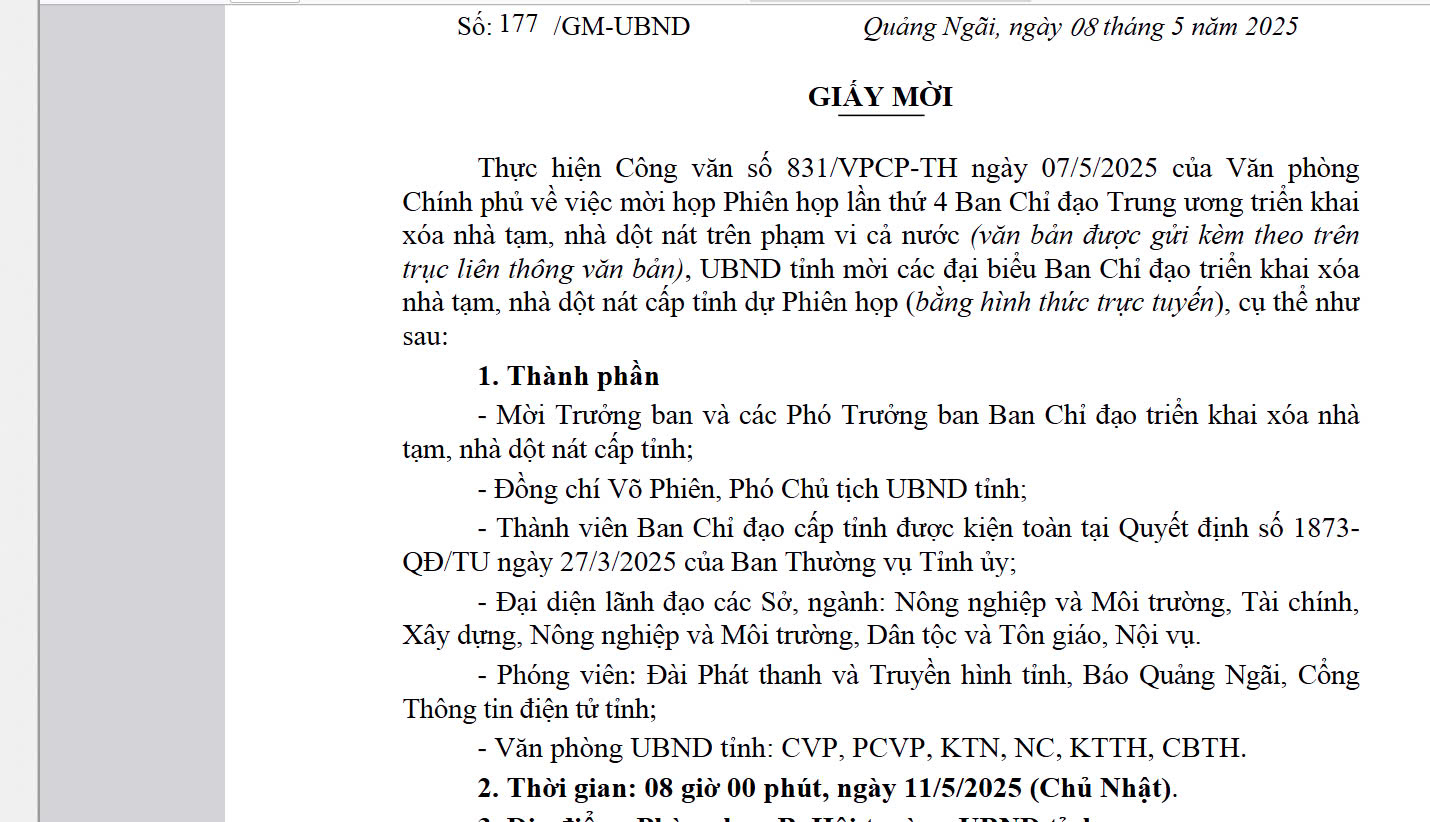 | 8h00. UBND tỉnh tổ chức Họp Ban chỉ đạo Kỳ thi tốt nghiệp Trung học phổ thông năm 2025 của tỉnh Quảng Ngãi Tài liệu: File đi kèm| | Đ/c Thịnh Phó Giám đốc | Phòng họp A, UBND | Phòng HCSN&DN |