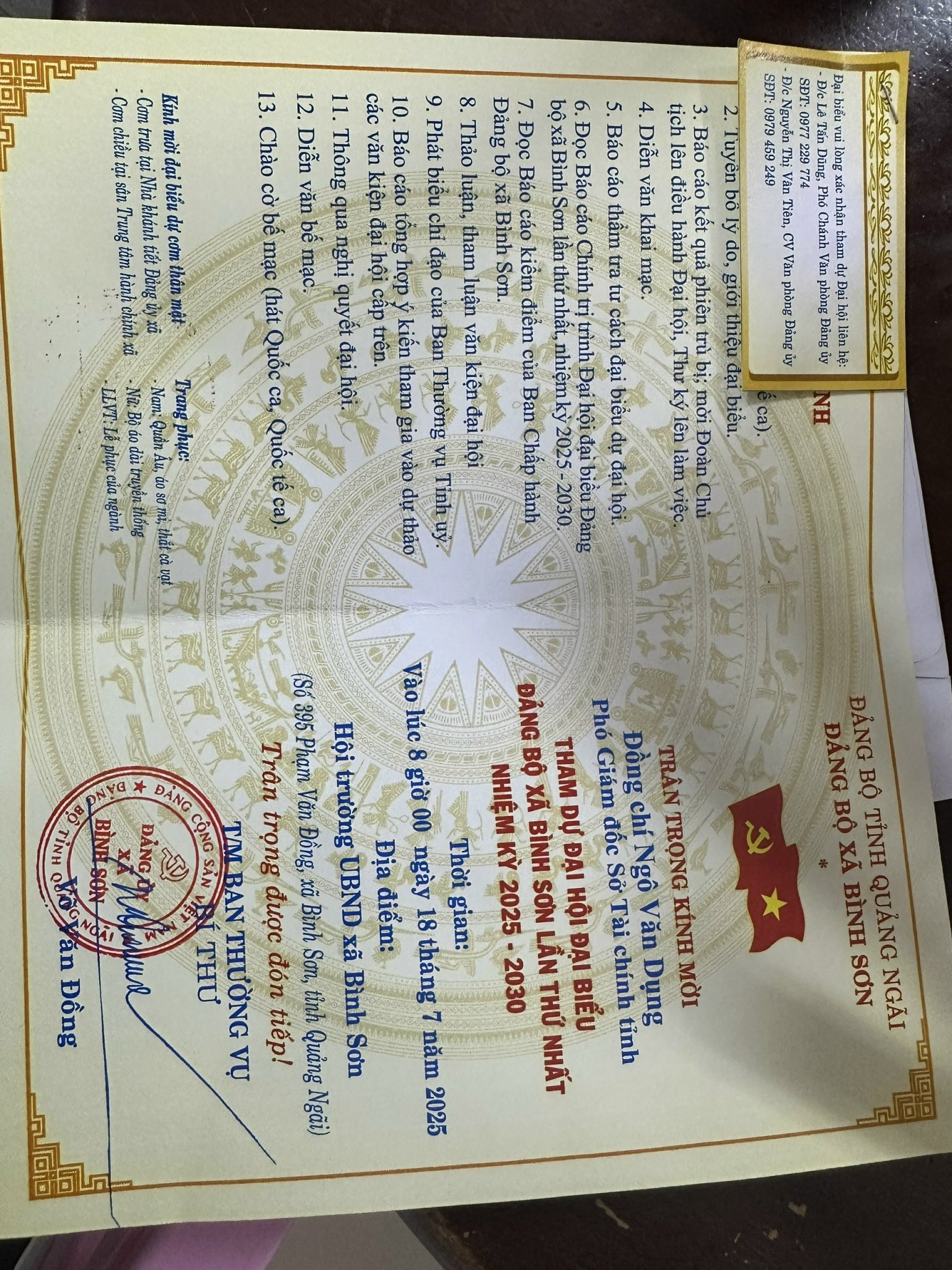 | 11h00. Giấy mời cơm "Ngày hội toàn dân bảo vệ ANTQ" năm 2025 tại xã YaLy Tài liệu: File đi kèm| | Đ/c U Thanh Phó Giám đốc | Nhà khách Hữu Nghị số 69 đường Bà Triệu, phường Kon Tum tỉnh Quảng Ngãi | |