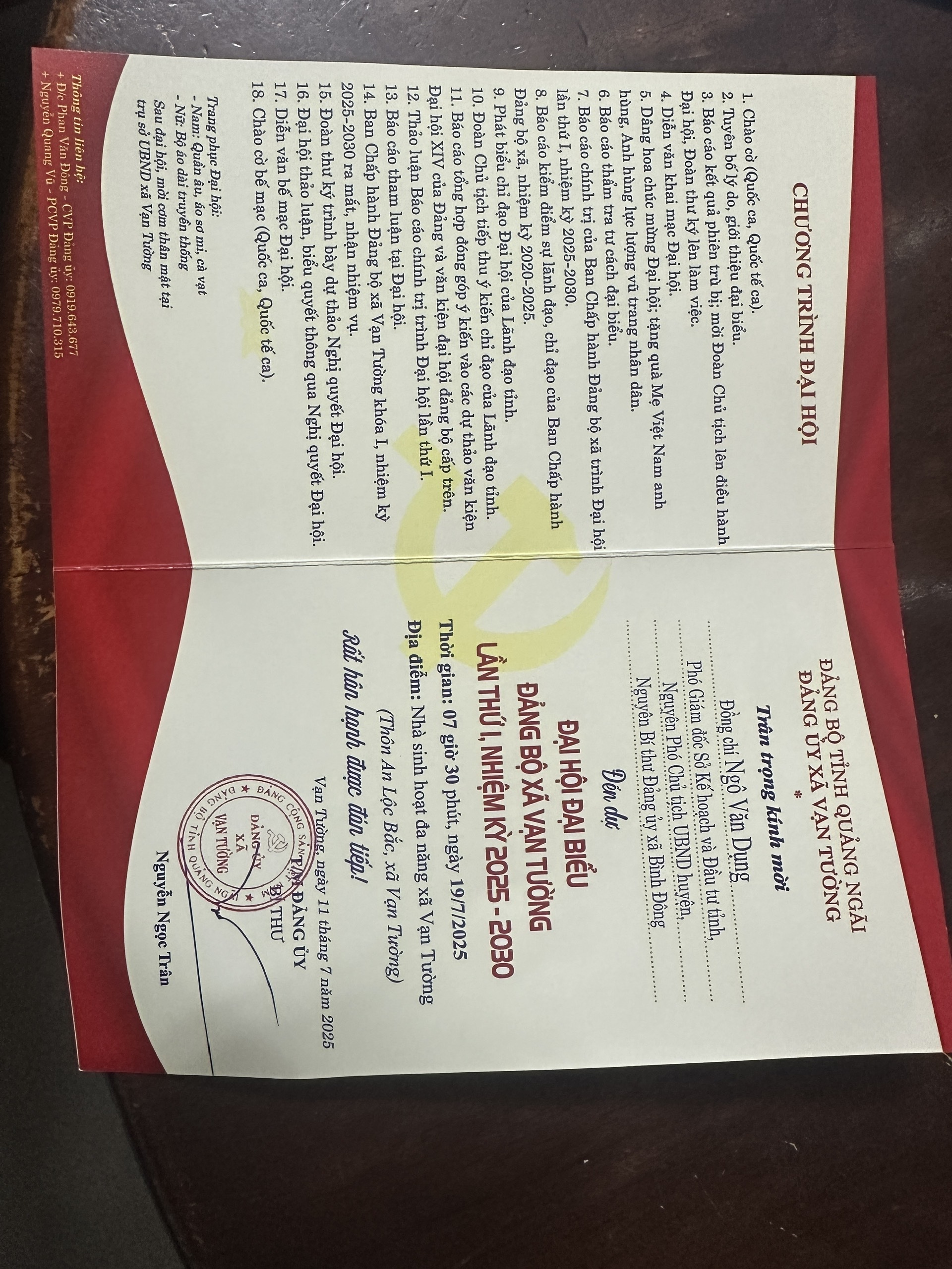Thứ 7 19/7 | Sáng | 7h30. Đảng ủy xã Vạn Tường mời dự Đại hội Đại biểu lần thứ I nhiệm kỳ 2025 - 2030 Tài liệu: File đi kèm| | Đ/c Dụng Phó Giám đốc | Nhà sinh hoạt đa năng xã Vạn Tường | Xe Tuấn phục vụ lãnh đạo |