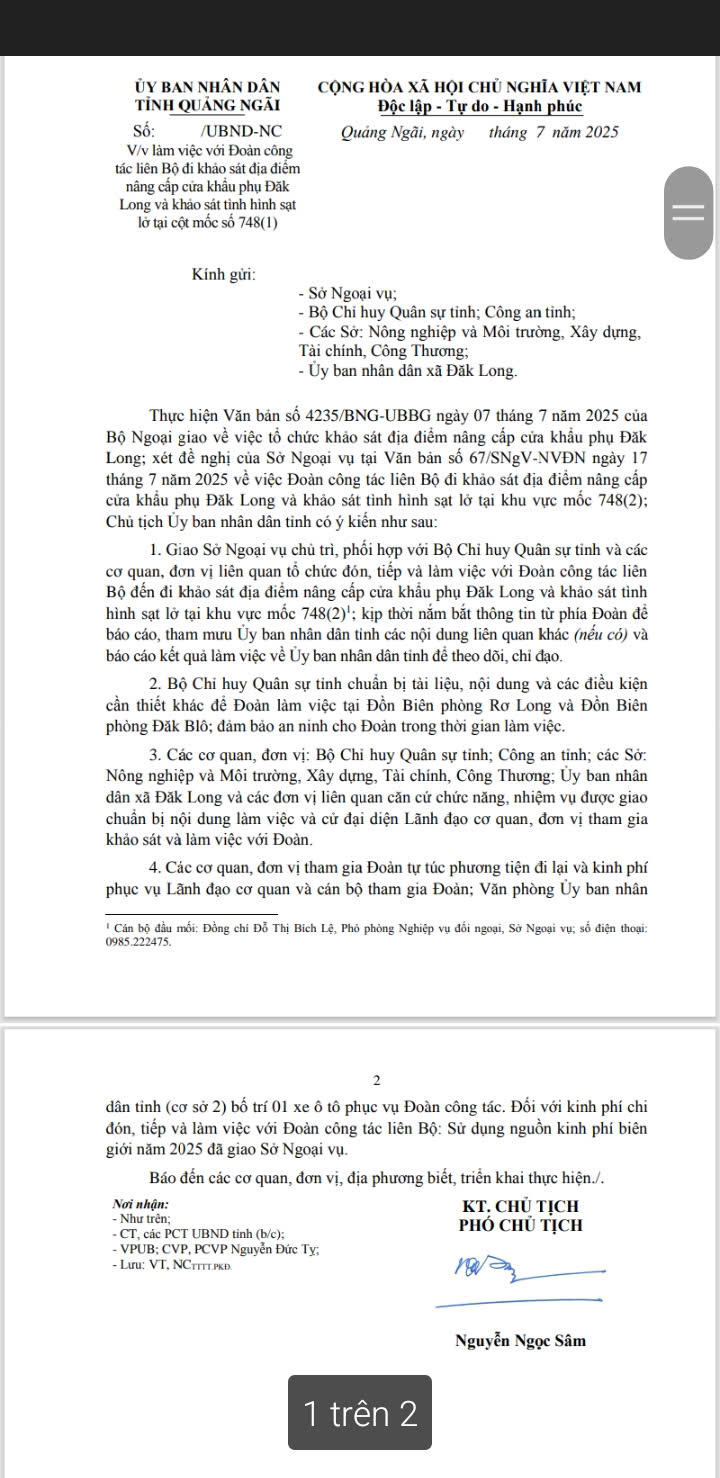 Thứ 2 21/7 | Sáng | 08h00. Tham gia Đoàn khảo sát liên Bộ đi khảo sát địa điểm nâng cấp Cửa khẩu phụ Đăk Long và khảo sát tình hình sạt lỡ khu vực mốc 748 Tài liệu: File đi kèm| File đi kèm| | Đ/c Văn Trung Phó Giám đốc | tại Đồn Biên phòng Rơ Long | |