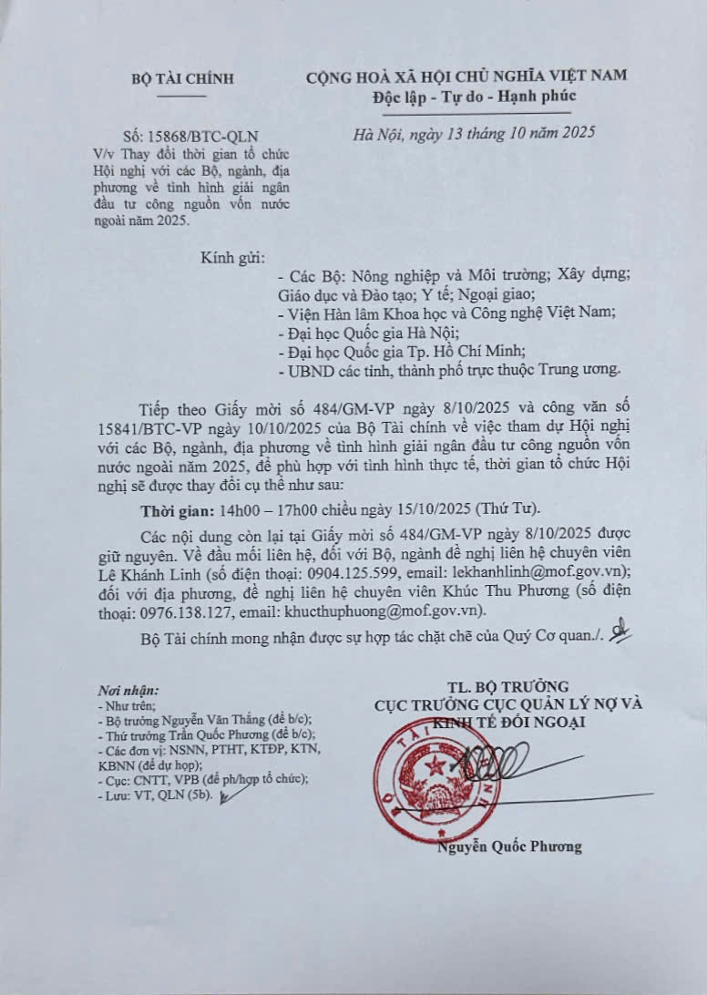 | 14h00. (Điều chỉnh thời gian) UBND tỉnh mời họp tham dự Hội nghị về tình hình giải ngân đầu tư công nguồn vốn nước ngoài năm 2025 Tài liệu: File đi kèm| File đi kèm| File đi kèm| File đi kèm| | Đ/c Duệ Giám đốc | Phòng họp trực tuyến, trụ sở Sở Khoa học và Công nghệ, Cơ sở 1 số 118 Hùng Vương, phường Nghĩa Lộ | Phòng TH, QH chủ trì phối hợp các phòng liên quan chuẩn bị nội dung cùng tham dự lãnh đạo |